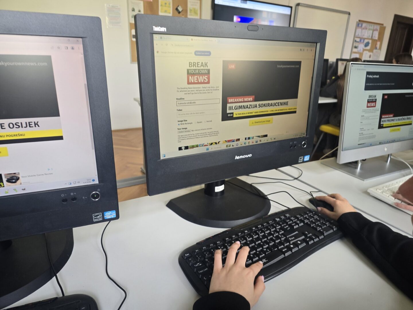9. travnja profesorice Dijana Šokčić i Ana Gusak Mikac održale su združenim snagama radionicu ,,Break your own news” (Stvori vlastitu izvanrednu vijest) u okviru projekta ,,Bez filtera”. Radionica je održana s učenicima prvih razreda, što se pokazalo odličnim jer su na početku svoga srednjoškolskog obrazovanja dobili korisne informacije i upute koje će im pomoći u kritičkom promišljanju o svijetu medija koji nas okružuje.