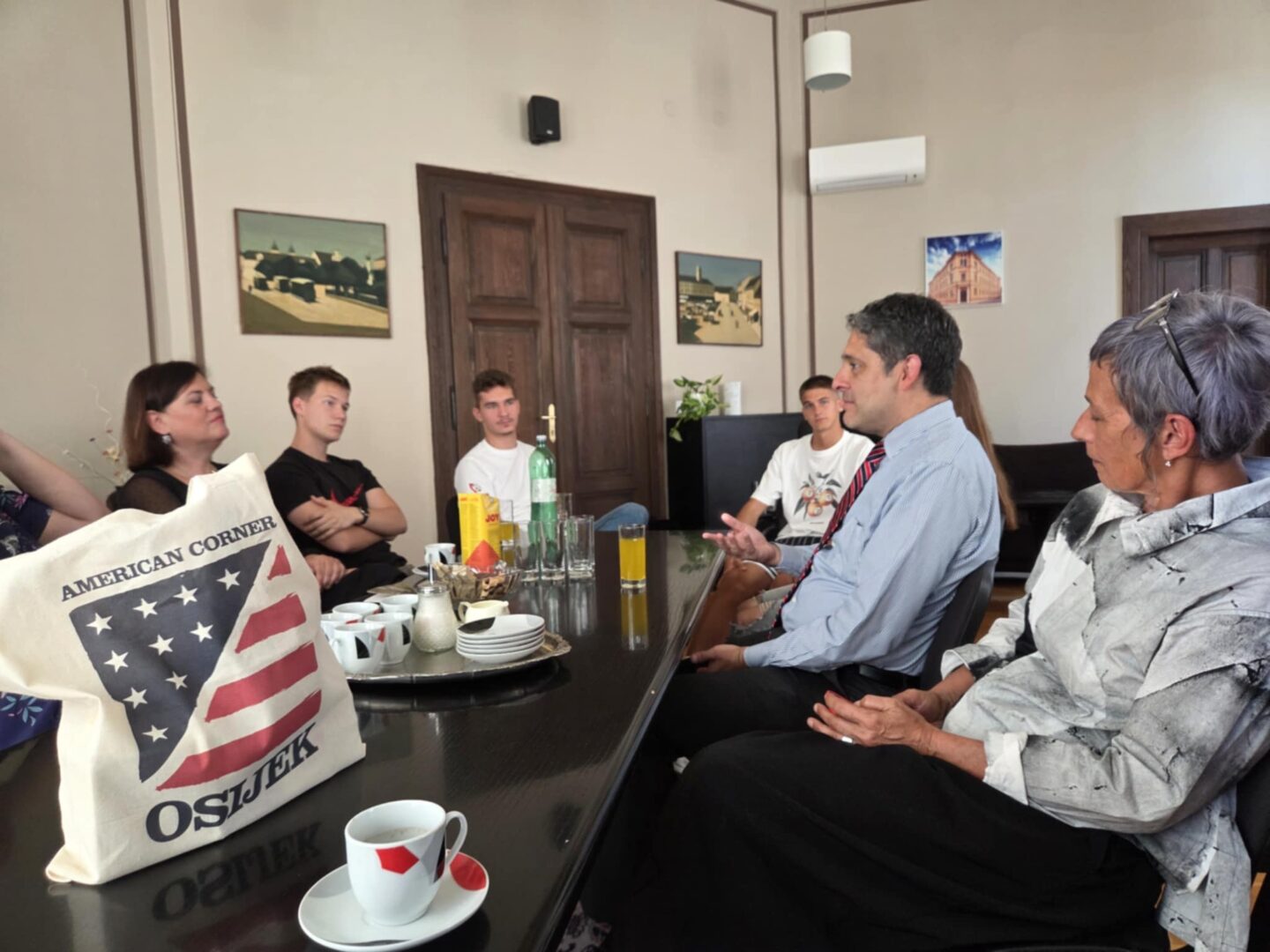 Opće je poznato da naša škola njeguje dugu suradnju s Američkim kutkom Osijek (American Corner Osijek), a 19. rujna 2025. imali smo još jedno posebno zanimljivo druženje s njima. Naime, Američki kutak Osijek ugostio je gospodina Oscara Avilu, novoga kulturnog atašea Veleposlanstva Sjedinjenih Američkih Država u Zagrebu, a slijedom toga dogodio se njihov zajednički posjet našoj školi.