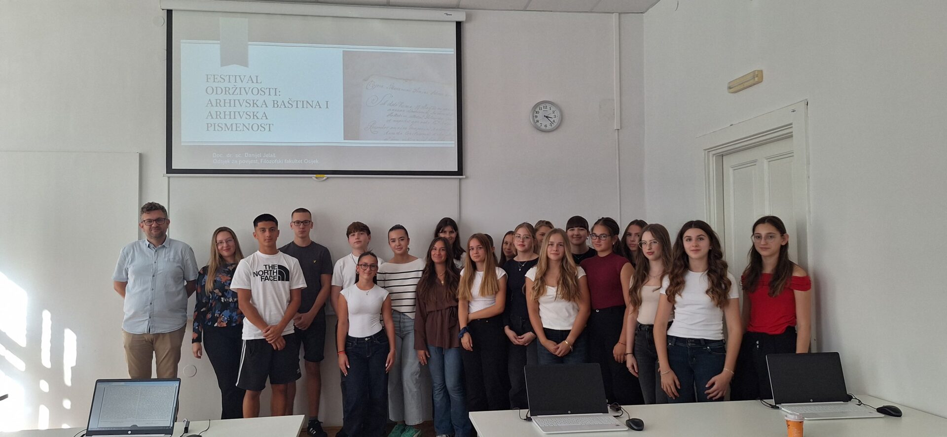,,U sklopu Festivala održivosti na našem je fakultetu održava radionica na temu Arhivska baština i arhivska pismenost u čijoj su organizaciji i izvedbi sudjelovali naš nastavnik doc. dr. sc. Danijel Jelaš, kolega s Odsjeka za Pedagogiju dr. sc. Nemanja Spasenovski i studentica povijesti i informacijskih znanosti Lana Trabak. U radionici su sudjelovali učenici III. gimnazije Osijek.”